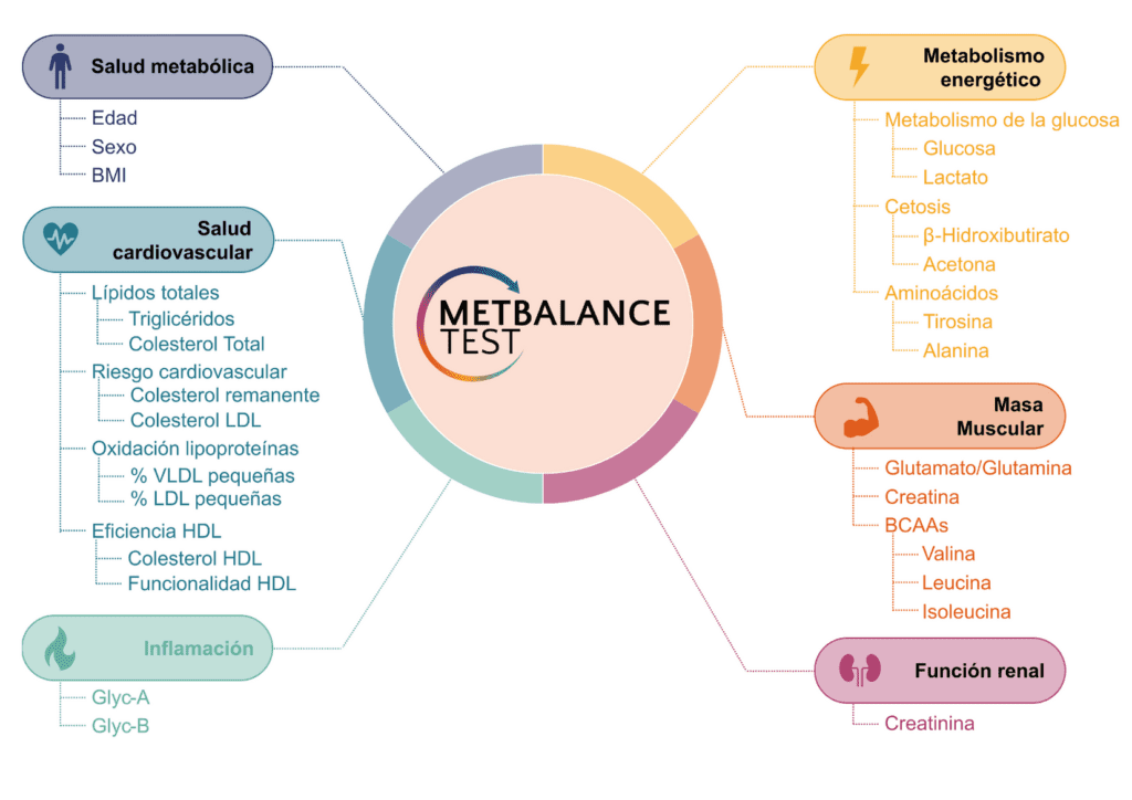 Además de determinar tu estado metabólico, el test MetBalance incorpora algoritmos de inteligencia artificial que permiten comparar tu perfil metabólico con respecto a los valores de una población general de más de 6.000 individuos incluyendo hombres y mujeres de un amplio rango de edad (mayores de 18 años). Dichos algoritmos permitirán conocer la edad de tu metabolismo y los diferentes parámetros incluidos en MetBalance así como evaluar su estado de salud mediante en análisis de la puntuación obtenida para cada uno de los parámetros analizados, permitiendo identificar la susceptibilidad o posible desarrollo de enfermedades metabólicas antes incluso de que se manifiesten los primeros síntomas.